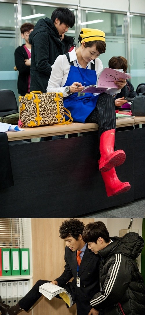 공개된 사진 속 김혜수는 청소복 차림으로 테이블 위에 걸터앉아 대본을 암기 중이며, 오지호는 다리 한 쪽을 사무용품 정리대에 걸쳐 놓은 고난이도 쩍벌남 자세로 대본을 외우고 있다.