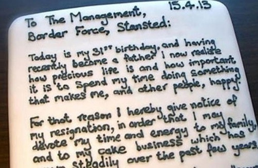 사직서 케이크가 등장해 화제다.영국의 한 언론은 16일(현지시각) 에식스 지역 스탠스테드 공항 출입국관리인 크리스 홈즈는 케이크로 사직서를 만들어 상사와 동료들에게 선물했다는 이야기를 전했다.
