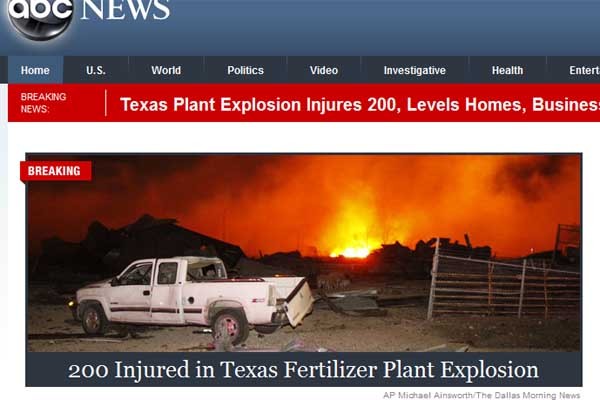 <서부 비료 공장(The West Fertilizer Plant)>에서 폭발사고가 발생,