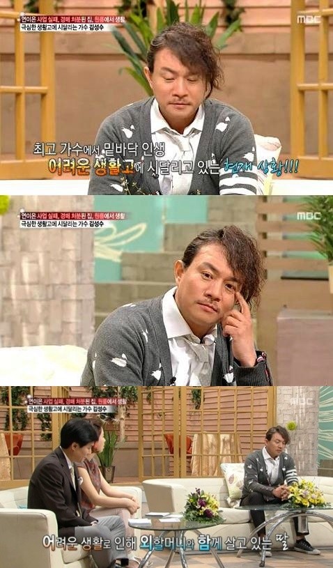 또한, 김성수는 “현재 주 수입원은 없다”라며 “일거리가 들어오는대로 하고 있다. 낮에는 사람들 시선 때문에 바깥출입을 안 하다가 밤에 모자를 눌러쓰고 외출한다”고 말해 안타까움을 자아냈다.
