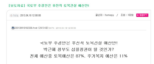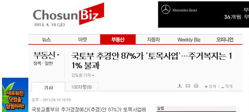 <조선비즈> 4월 18일자는 국토위 이미경의원(민주통합당)이 자기 사이트에 올린 보도자료를 인용하여 다음과 같은 취지로 보도했다.“국토부의 추가경정예산 중에서