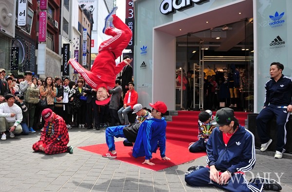 스포츠 브랜드 아디다스는 19일 오전 서울 중구에 위치한 국내 최대 아디다스 명동플래그십 스토어 리뉴얼 오픈을 기념해 [2NE1]과 [B-Boy팀(Prepixcrew)]이 함께하는 댄스플래시 몹 이벤트를 진행했다.