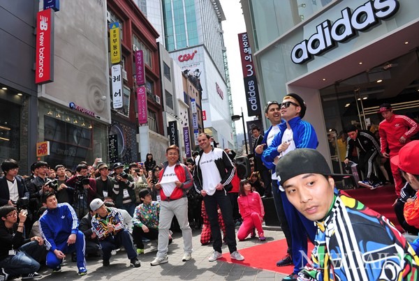 이날 행사에는 걸그룹 2NE1과 비보이팀, 아디다스 관계자가 참석해 화려한 군무에 맞춰 멋진 댄스 퍼포먼스를 선보이고 리뉴얼 된 매장에 방문해 체험하는 시간을 가졌다.