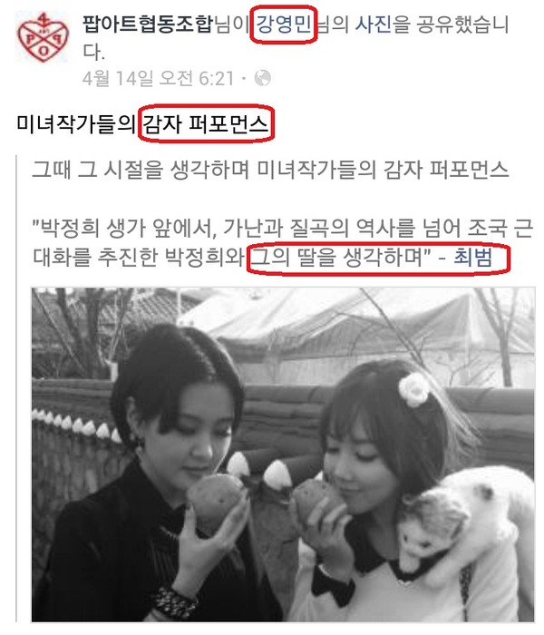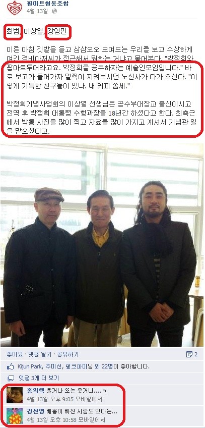 이들의 페이스북을 보면, <팝아트협동조합> 멤버들이 [아버지뻘 되는] 어르신을 대놓고 희롱하고 있음을 알 수 있다.