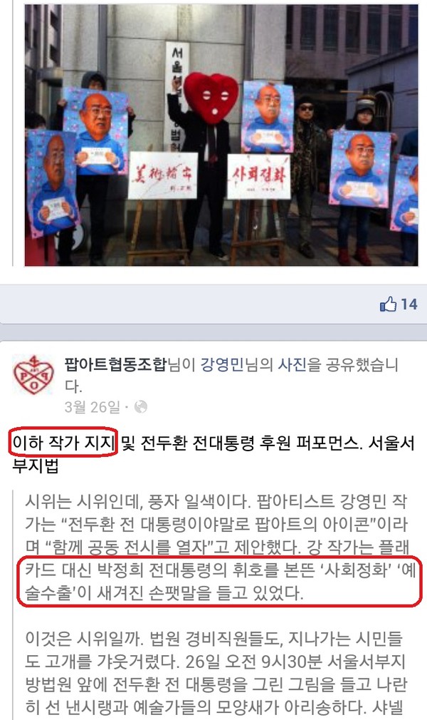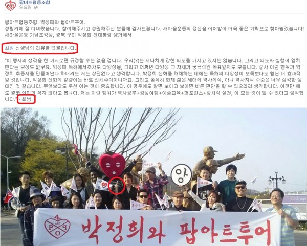 2. 팝아트협동조합이 지난 13일 주최한 ‘박정희와 팝아트투어’는 두 매체가 주장하는 대로 ‘박정희 모욕’을 위한 목적이 전혀 아니었다는 사실을 다시 한번 밝힙니다. 이 사실은 지난 16일 조합 홈페이지를 통해 이미 밝혔으며, 같은 날 조선일보에 보도 되었습니다. 두 매체는 더 이상의 거짓 왜곡 보도를 멈추고, 사실관계를 정확히 파악하여 정정기사를 내보내길 요청합니다.