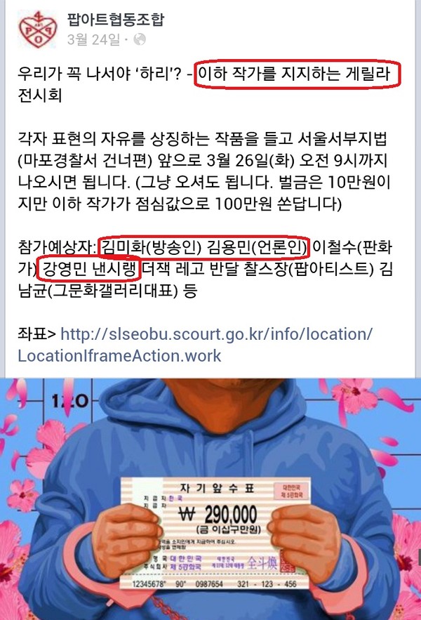 이날 낸시랭은 [깡통진보] 성향의 <팝아트협동조합> 예술가들과 행동을 같이했다.