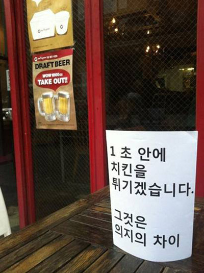 공개된 사진에는 한 치킨 집 입구에 쓰인 안내문이 담겨 있으며 “1초안에 치킨을 튀기겠습니다. 그것은 의지의 차이”라는 글이 적혀 있다.