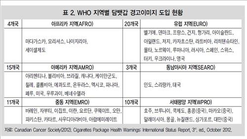 22일 보건사회연구원의 '세계적 대세:담뱃갑 경고 이미지' 보고서에 따르면 캐나다 암협회(CCS) 조사 결과, 작년 10월 현재 담뱃갑 경고 이미지 규정을 시행하고 있는 나라는 63개에 이른다.