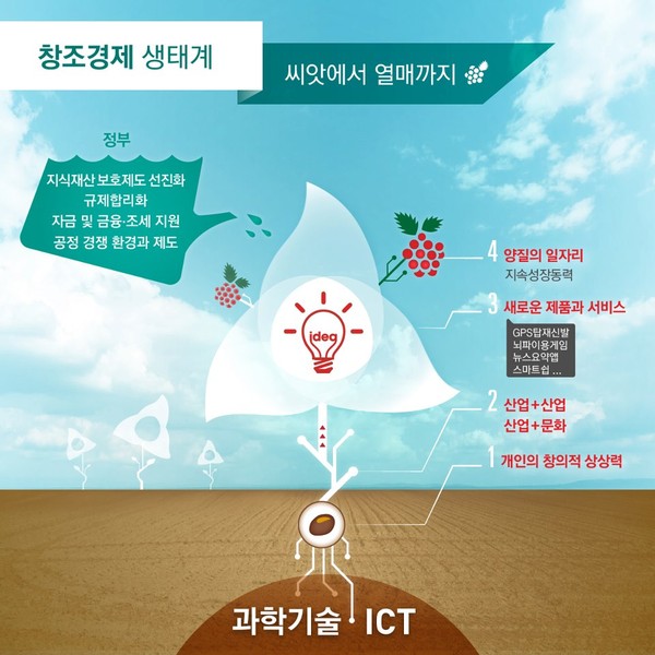정보통신기술(ICT)이란 씨앗이 개인의 창의력과 만나 양질의 일자리로 성장해 열매를 맺는 모습으로 그려졌다.먼저 ICT가 개인의 창의적 상상력과 만난 뒤, 산업과 산업, 혹은 산업과 문화 간의 융합을 거치게 된다. 이 산업과 만난 아이디어는 새로운 제품과 서비스로 소비자에게 전달된다.