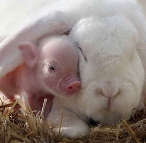 공개된 사진에는 돼지와 토끼가 다정하게 붙어있는 모습이 담겨 있다. 보통 돼지의 경우 토끼에 비해 크지만 사진 속에서는 반대로 토끼가 돼지에 비해 2~3배 더 커 보인다.