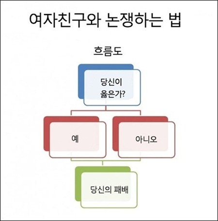 공개된 게시물은 여자친구와 논쟁하는 법을 짧은 순서도로 표현해 놓았다. “당신이 옳은가”라는 질문에 대해 예, 아니오로 답변을 선택할 수 있게 되어 있다.