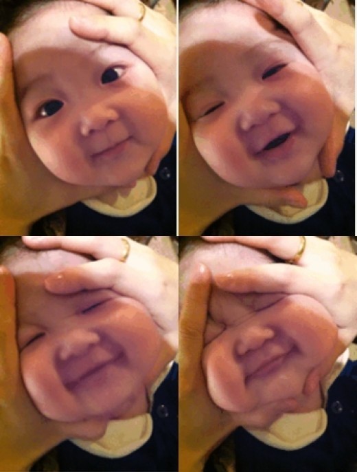 공개된 사진에는 아기의 얼굴로 장난을 치고 있는 모습이 담겨 있다. 아빠로 추측되는 어른이 손으로 아기의 얼굴을 감싸 표정을 일그러지게 만든다. 특히, 지난친 장난에도 아기는 계속 웃고 있으며, 크고 동그란 눈에 통통한 볼살이 귀엽다.