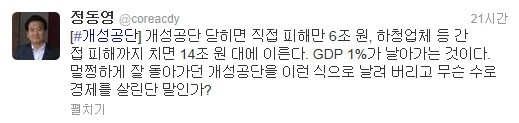 盧정권에서 통일부 장관을 지낸 그는 자신의 트위터에 이 같은 말도 남겼다.“개성공단 닫히면 직접피해만 6조원,