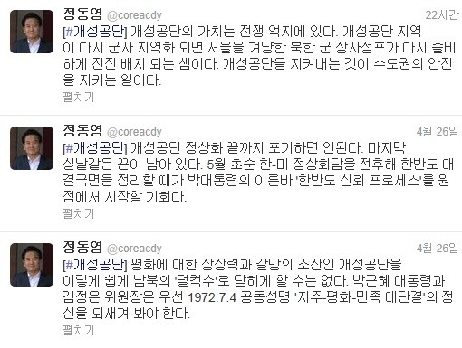 그는 트위터를 통해 “개성공단의 가치는 전쟁 억지에 있다”고 주장하기도 했다.“개성공단의 가치는 전쟁 억지에 있다.