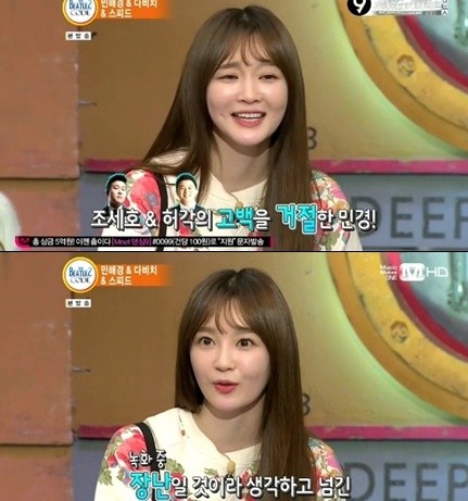 강민경은 지난 29일 방송된 Mnet <비틀즈코드2>에서 개그맨 조세호와 가수 허각의 대시를 거절했다는 MC들의 질문에 솔직한 입장을 밝혔다.