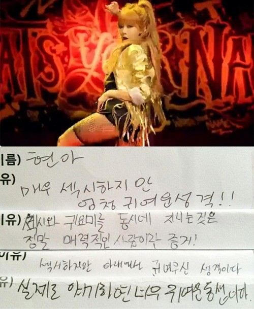 공개된 사진에는 현아 실제 성격에 대한 레인보우 우리, 빅스 라비, 보이프렌드 정민, 달샤벳 세리 등 동료 아이돌의 평가가 자필로 적혀 있다.