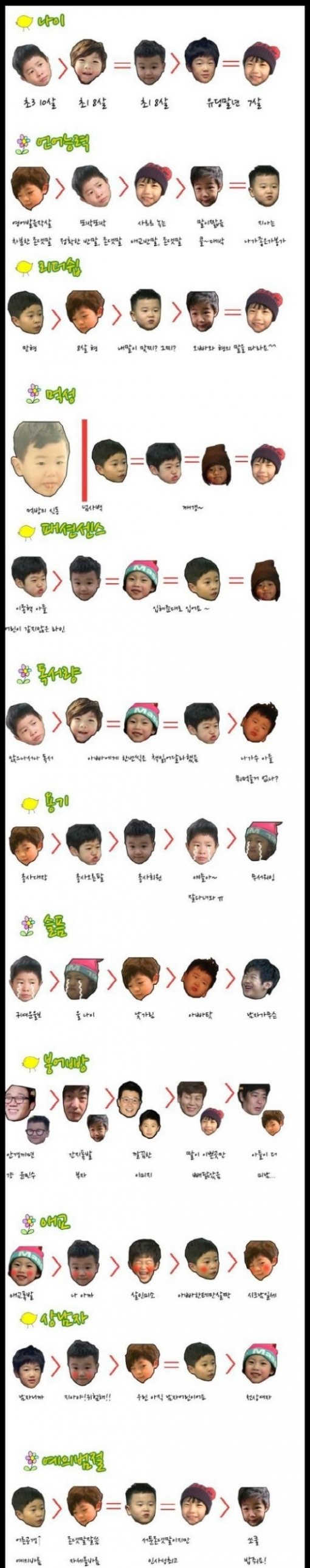<아빠 어디가> 서열이 화제다.최근 한 온라인 커뮤니티에는 MBC [일밤-아빠! 어디가]에 출연 중인 다섯 어린이의 서열을 나이, 언어능력, 리더십, 먹성, 패션센스 등 12가지 항목에 따라 분석한 게시물이 올라왔다.