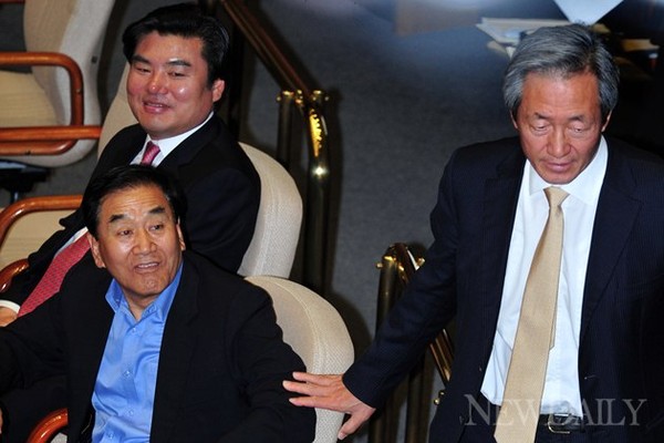 30일 오후 제315회 국회(임시회) 제4차 본회의가 열린 국회 본회의장에서 이재호, 정몽준 의원이 인사를 나누고 있다.