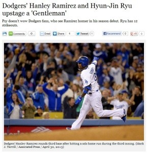 14일 경기 직후 <LA타임스>는 "류현진은 한국에서 7년간 타석에 들어선 적이 없는데도 놀라운 타격 솜씨를 뽐내고 있다"며 애리조나 장내 아나운서가 그에게 [베이브 류스]라는 별명을 붙여준 사실을 전한 바 있다.
