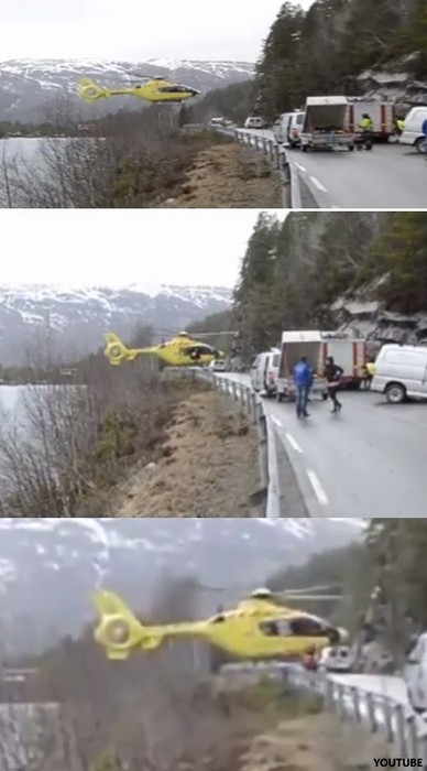 노르웨이 산악도록에서 일어난 자동차 사고가 났다는 신고를 받은 당국은 응급 구조 헬리콥터를 보냈다.