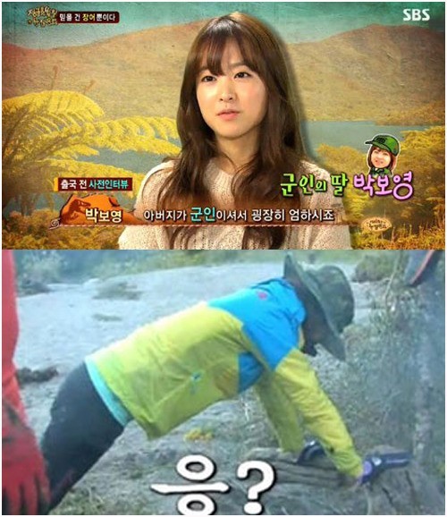앞서 박보영은 제작진과의 사전 인터뷰에서 “아버지가 군인이라 엄하시다. 혼나면 얼차려를 받는다. 엎드려뻗쳐도 한다”고 밝혀 그녀의 팔굽혀펴기 실력에 멤버들의 관심이 쏠렸다.