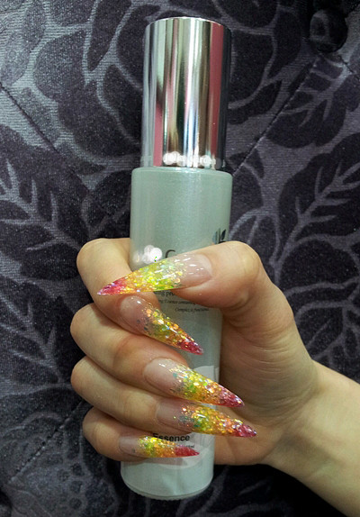 엔퓨오 블링블링 형광 글리터로 한 손씩 아크릴, 젤을 이용해 익스텐션 자체로 화려함을 살린 스타일.