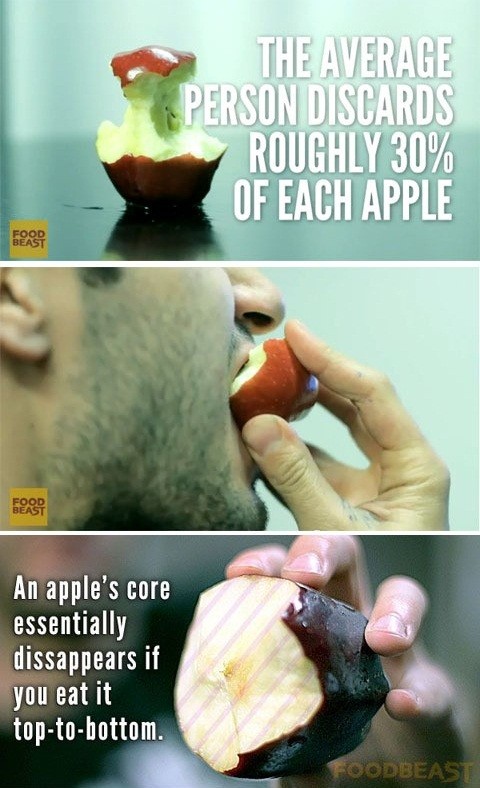 이 영상은 “우리는 평생 사과를 잘못 먹었다”는 다소 자극적인 말로 시작한다. 이어 “사과를 옆면으로 돌려가며 먹을 경우 30%를 낭비하게 된다”며 “아래나 위쪽부터 사과를 먹기 시작하면 낭비되는 사과 양을 현격히 줄일 수 있다”고 설명했다.