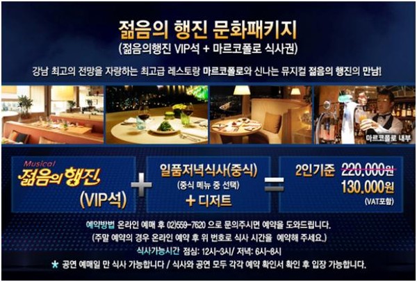 뮤지컬 <젊음의 행진>이 가족과 연인들을 위해 즐거운 식사와 신나는 공연까지 함께 해결할 수 있는 [젊음의 행진 문화 패키지]를 마련해 관객들로 하여금 높은 만족도를 보이고 있다.[젊음의 행진 문화 패키지]는 <젊음의 행진> VIP석과 그랜드 인터컨티넨탈 마르코폴로 일품 중식 디너 식사권이 포함돼 있으며, 2인 기준으로 40% 할인된 130,000원이라는 파격적인 가격으로 만나볼 수 있다.