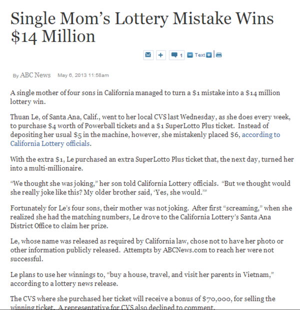 미국에서 네 아들을 둔 한 미혼모가 실수로 구매한 로또 덕분에 1,400만 달러(약 152억5,300만원)를 거머쥐는 행운을 얻었다.7일 미 ABC방송에 따르면 캘리포니아주 산타아나에 사는 <투안 레>는 지난 1일 평소 로또를 구매하던 판매점에 들러 파워볼 복권 4달러어치와 슈퍼로또 플러스 복권 1달러어치를 사려 했다.그러나 실수로 복권 판매기에 돈을 많이 집어넣으면서 슈퍼로또 플러스 복권 한 장을 더 사게 됐고, 결국 이 복권이 1등에 당첨된 것.베트남계 미혼인 레는 당첨금으로 집을 사고 베트남의 부모 집도 방문할 계획인 것으로 알려졌다.캘리포니아 현행법은 복권 당첨자의 실명 공개를 의무화하고 있지만, 레는 이름 외에 사진과 추가 신원 공개를 거부했고 언론과의 인터뷰도 거절했다고 방송은 전했다.사진= abc news