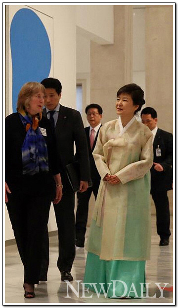 평소 화려하지 않은 박 대통령 평소 스타일을 반영한 한국에서의 한복과는 거리가 멀었다.잔뜩 멋을 낸 화려한 자태.