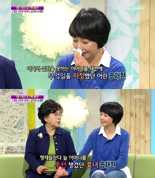 이에 송채환의 어머니는 “초등학교 3학년 때부터 딸이 나 대신 살림을 했다. 음식도 하고 청소까지 다 했다. 장도 그렇게 꼼꼼하게 잘 봤다. 정말 고맙고 미안했다”며 딸에 대한 고마움을 드러냈다.