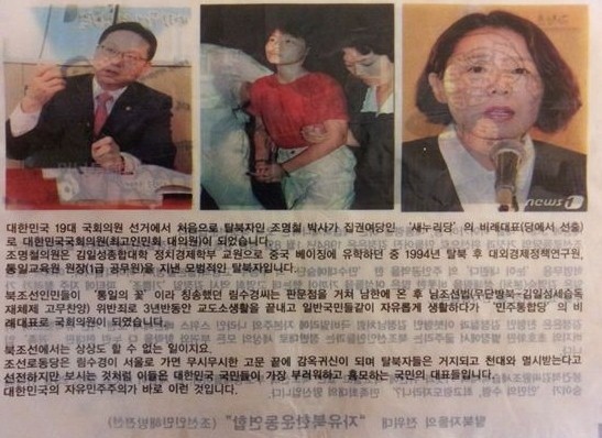 "대한민국 19대 국회의원 선거에서 처음으로 탈북자인 조명철 박사가 집권여당인 ‘새누리당’의 비례대표(당에서 선출)로 대한민국국회의원(최고인민회 대의원)이 되었습니다.