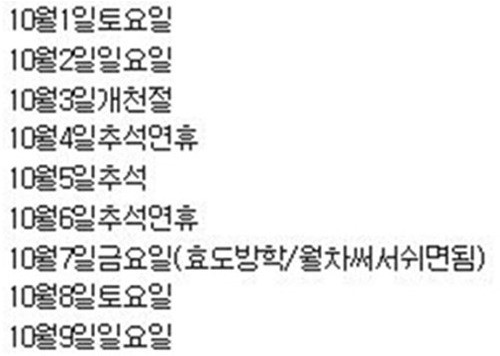 글쓴이는 “추석 연휴와 토요일 사이에 낀 7일에 직장인은 월차를 쓰면 되고, 학생은 효도방학이 있기 때문에 쉴 수 있다”는 설명을 덧붙였다.