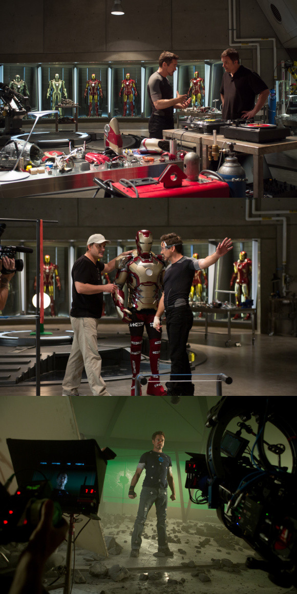 이번에 공개된 스틸에서는 관객들이 제일 궁금해 하는 부분인 수트 착용 모습과 연구실에서 수트 개발을 연출하는 모습 등이 담겨 있어 이목을 집중시킨다. 다양한 수트가 전시되어 있는 토니 스타크의 연구실에서 아이언맨 수트를 세워놓고 셰인 블랙 감독과 진지한 대화를 나누는 듯한 로버트 다우니 주니어의 모습에서 영화에 대한 열정이 느껴진다.