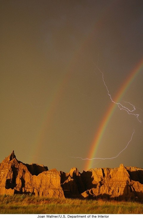 공개된 쌍무지개 관통한 번개 사진은 미국 사우스다코타주 배들랜즈국립공원에서 촬영된 것으로 알려졌다.