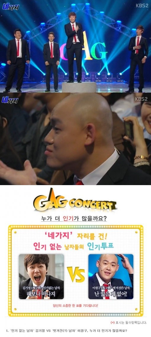 실제로 <네가지> 코너가 끝나자마자 <개콘> 홈페이지에서는 “인기 없는 남자 김기열 vs 벗겨진(?) 남자 이원구, 누가 더 인기가 많을까요?”라는 주제로 투표가 진행되고 있다. 투표 결과는 다음주 방송 전까지 비공개로 오는 15일 오후 7시까지 이어진다.