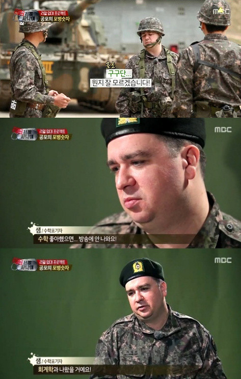 호주 출신 방송인 샘 해밍턴이 구구단과 수학에 대한 어려움을 토로했다.지난 12일 방송된 MBC <일밤-진짜 사나이>에서는 김수로, 서경석, 류수영, 미르, 손진영, 샘 해밍턴이 강원도 인제에 위치한 산악포병여단 화룡대대에서 훈련을 받는 모습이 그려졌다.