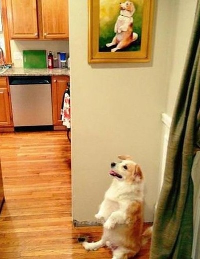 공개된 사진에는 두 발을 들고 위를 올려다 보고 앉아 있는 개의 모습이 담겨 있다. 그런데 개 머리 위에 똑같은 포즈를 취하고 있는 개 그림 액자가 걸려 있어 눈길을 끈다.