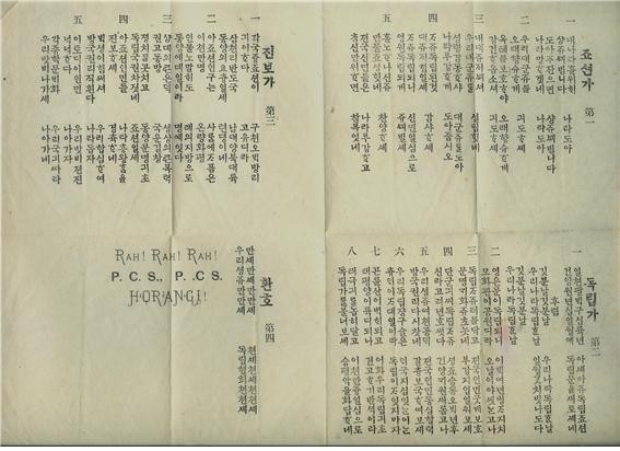 가로 31.6㎝, 세로 23.8㎝ 크기의 이 종이는 바로 1896년 11월 21일 독립문 정초식(定礎式·착공식) 때 불렸던 기념가 전단의 실물(實物). 'P.C.S.'란 '배재 크리스천 스쿨'로 독립문 정초식 당시 세 곡의 노래를 불렀던 배재학당 학생들을 의미한다.