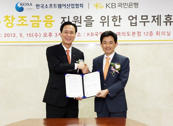 KB국민은행(은행장 민병덕)은 15일 오후 한국소프트웨어산업협회(회장 조현정)와 여의도 본점에서 국가 신성장 동력 발굴과 창조경제 활성화를 위한 창조금융 지원 업무제휴 협약을 체결했다.한국소프트웨어산업협회는 국내 7,000여 소프트웨어 기업의 권익을 대변하고