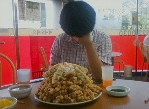 공개된 사진에는 접시 위 수북이 쌓인 탕수육을 앞에 놓고 얼굴을 손으로 가린 채 고개를 푹 숙인 한 남성의 모습이 담겨 있다.