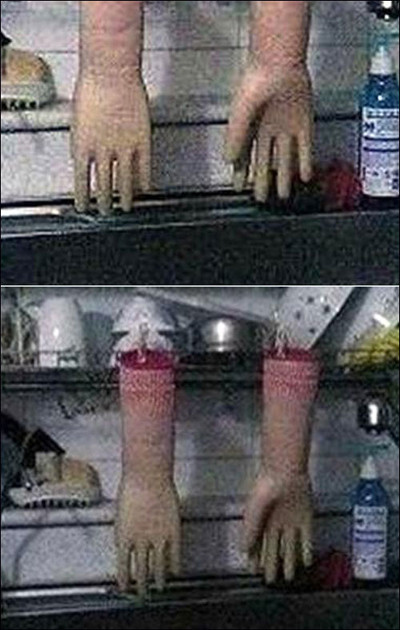공개된 사진에는 고무장갑이 뒤집혀져 부엌에 걸려있는 모습이 담겨 있다. 언뜻 보면 마치 사람의 팔목이 잘린 것처럼 보여 섬뜩함을 자아낸다.