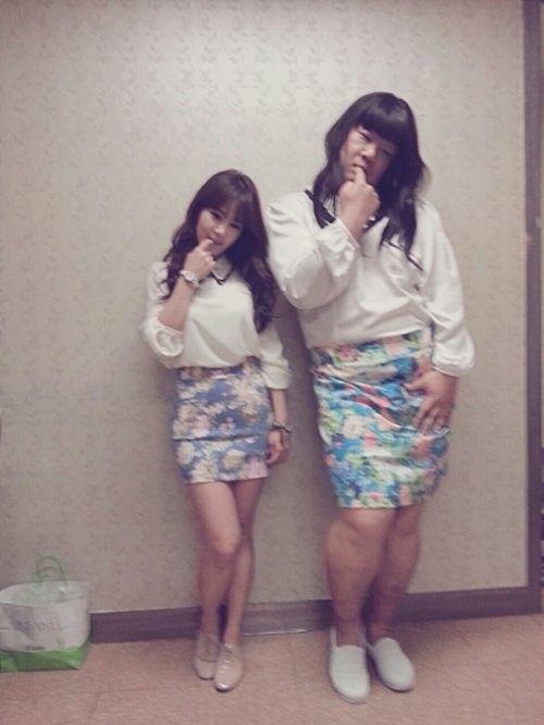 공개된 사진 속 김지민은 개그맨 유민상과 흰색 블라우스에 꽃무늬 스커트를 입고 똑같은 포즈를 취하고 있다. 하지만 김지민의 두 배에 달하는 유민상의 얼굴 크기와 몸집이 보는 이들의 폭소를 자아냈다.