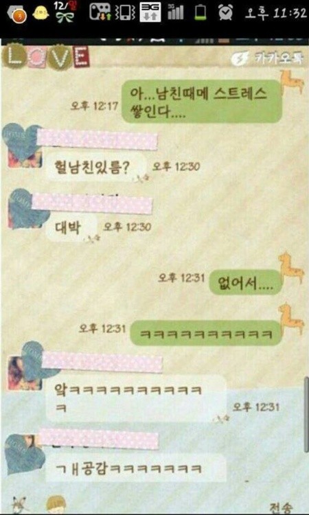 공개된 사진은 두 친구의 스마트폰 메신저 대화내용을 캡처한 것이다. 한 여성이“남자친구 때문에 스트레스 쌓인다”고 말하자 친구는 “남자친구 있었느냐”며 묻는다.