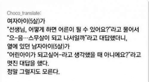 해당 글에는 선생님과 어린 아이들이 대화한 내용이 담겨 있다. “어떻게 하면 어른이 될 수 있느냐”는 5살 여자아이의 질문에 선생님은 “으음.. 스무살이 되고 나서일까?”라고 답한다.