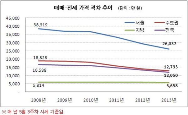 서울지역의 [매매-전세가] 격차가 5년 전보다 1억 2,282만원 줄었다.