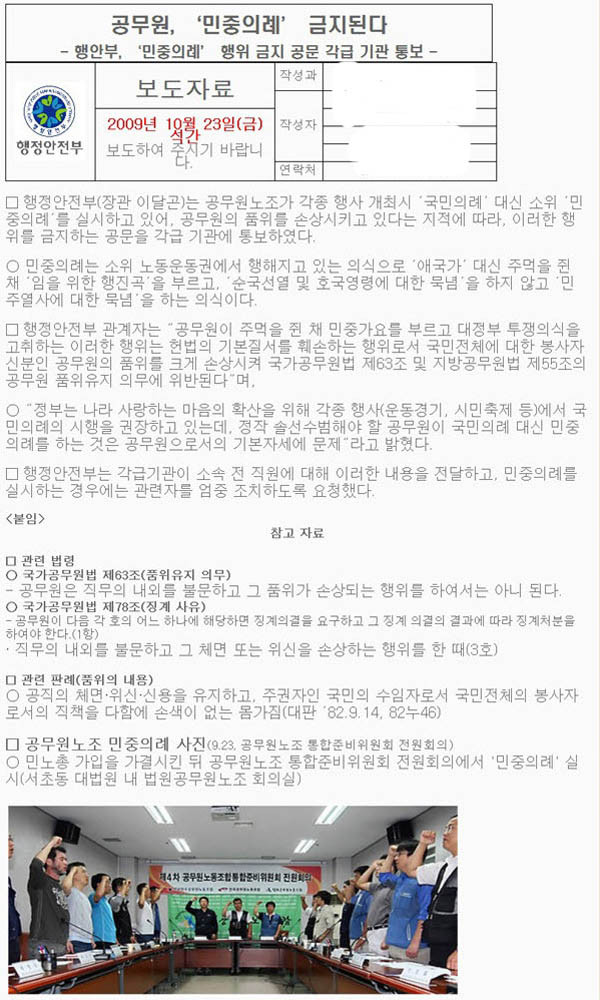 ■ 행정안전부(이하 행안부)는 2010년 5월 공무원노조가 각종 행사에서 ‘국민의례’ 대신 ‘민중의례’를 실시하고 있어, 공무원의 품위를 손상시키고 있다는 지적에 따라, 이러한 행위를 금지하는 공문(하단 자료 참고)을 각급 기관에 통보한 바 있다.