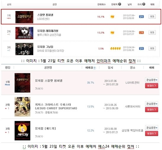 대형 라이선스 뮤지컬 <스칼렛 핌퍼넬>이 티켓 오픈과 동시에 주요 예매 사이트 예매율 1위를 차지했다.올 여름 뮤지컬 빅뱅 속에서 최고의 기대작으로 손꼽히는 뮤지컬 <스칼렛 핌퍼넬>은 브로드웨이 초연 이후 16년을 기다린 끝에 CJ E&M이 제작하여 국내에서 처음 공연되는 작품이다.