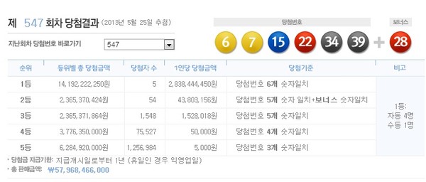 2013년 5월 25일 실시된 제547회 나눔로또 1등 당첨번호는 ‘6, 7, 15, 22, 34, 39’번이며, 2등 보너스 번호는 28번이다.