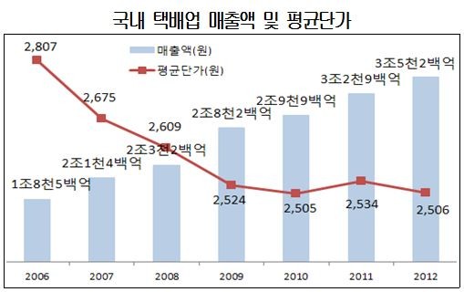 택배 1박스당 평균단가는 전년대비 28원 하락한 2506원으로 집계됐다.지난 2006년 2807원이었던 박스당 평균단가는,